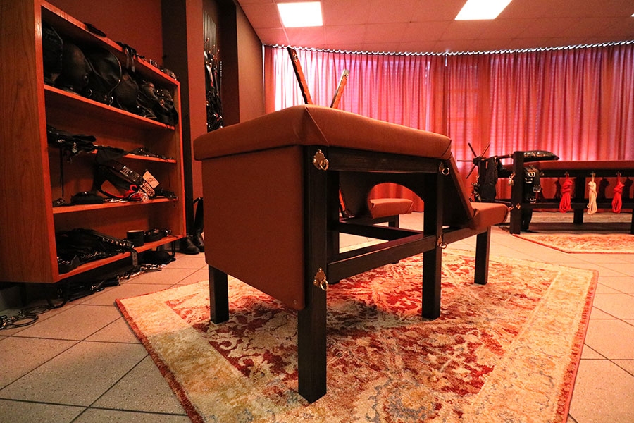 Das repräsentative stimmungsvolle 46 qm große Leder- und Bondage-Zimmer mit originellen Holz-Leder-Möbeln, wie große Streckbank, Strafbock und Andreaskreuz in warmen Lederfarben und echter Mid-Century-Design-Einrichtung lädt den Besucher auf eine bizarre Reise ein.