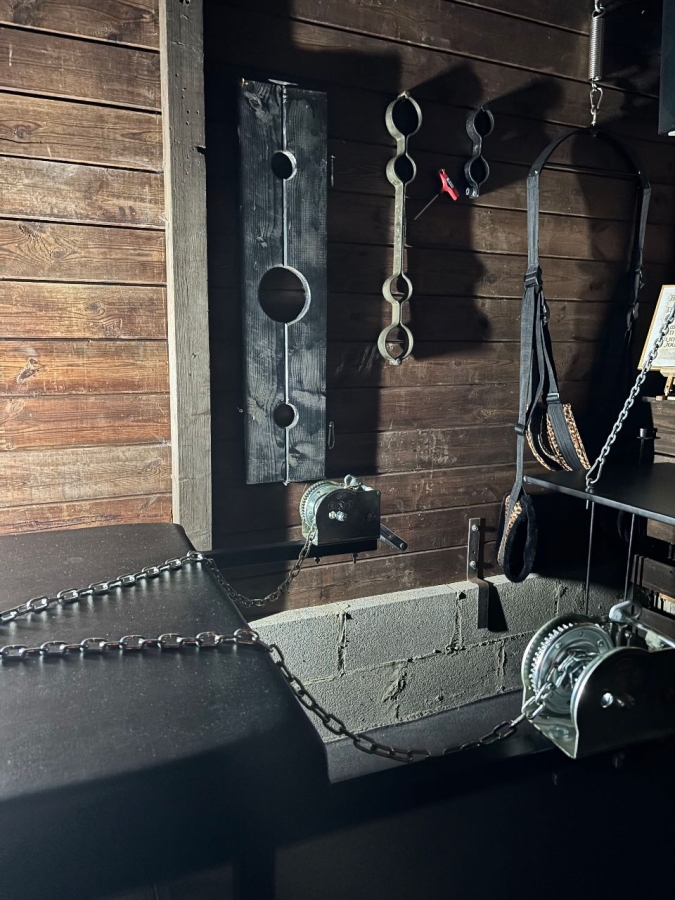 - 3 Folter- und Verhörräume mit Fesselbank, Folterstuhl, Anal-Spieß-Rack, Igelthron, Pranger, CBT-Parkgestell auf Rädern, mechanisches Deepthroat-Foltergerät, eisernes CBT-Pferd
